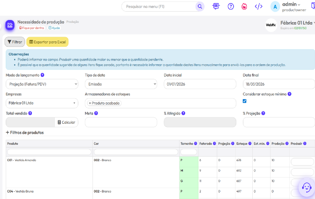 A necessidade de produção ajuda a enxergar o que realmente precisa ser feito. Com isso, a fábrica reduz chute, protege melhor o estoque e produz com mais coerência em relação à demanda.
