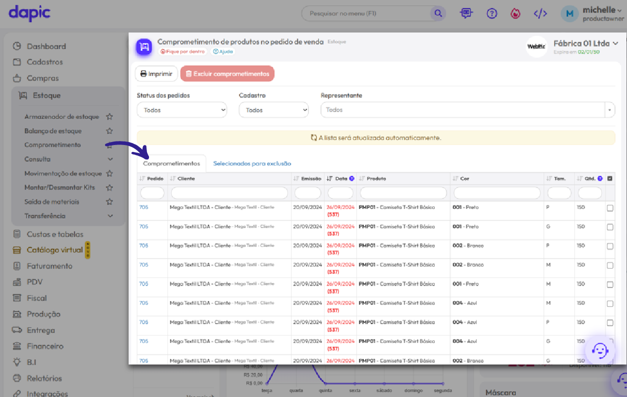 Com o Catálogo Nativo do Dapic, você manda um link e o cliente compra sozinho: navega por categorias, escolhe cor/tamanho por grade e fecha no carrinho. O pedido já entra no ERP para confecção pronto para faturar e expedir.